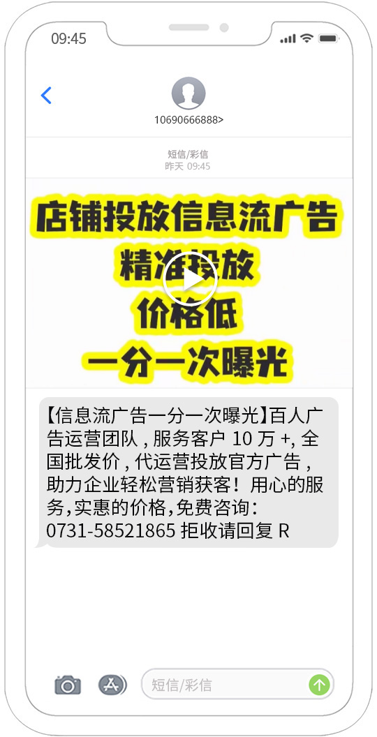 視頻短信發送能夠覆蓋移動、聯通、電信用戶,正規集團視頻短信通道,快速、可靠、穩定、形象好,能快速將您的訊息投放到用戶的手機。